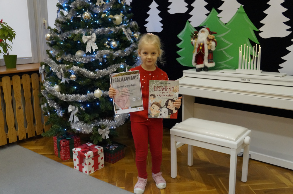 W dniu 16.12.2024r. Alicja odebrała nagrodę za udział w konkursie plastycznym „Świąteczny czar w rodzinnej bombce”, zorganizowanym przez VIII Ogród Jordanowski w Warszawie.