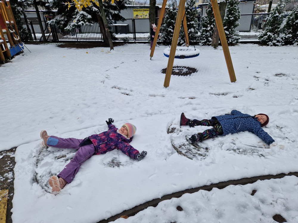 Zima przyszła w tym roku wcześniej, zanim nacieszyliśmy się na dobre jesienią. Ale my nie narzekamy, tylko z uroków zimowej aury i śniegu korzystamy! :) Był dziś pierwszy bałwan, pierwsze aniołki na śniegu, rzuty śnieżkami do celu, toczenie wielkich śniegowych kul i - co widać na zdjęciach - było również baaaardzo dużo radości! :)